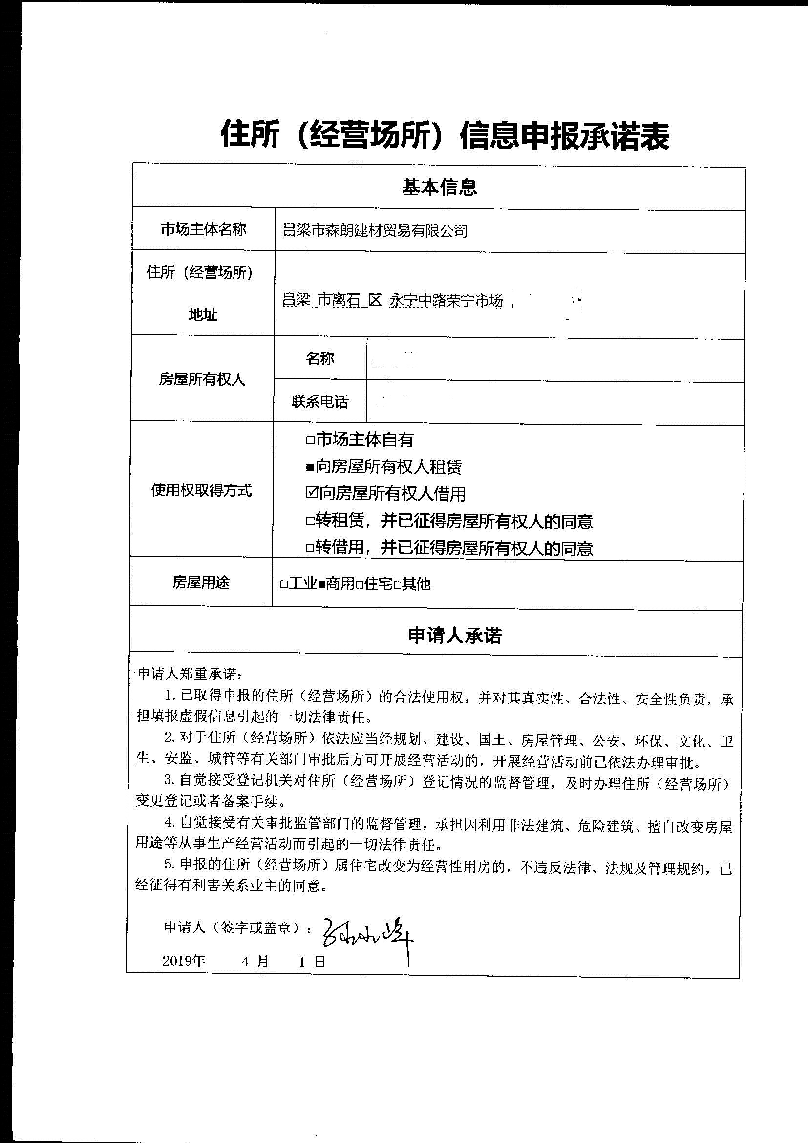 【主动公示型信用承诺书】吕梁市森朗建材贸易有限公司:经营场所承诺书