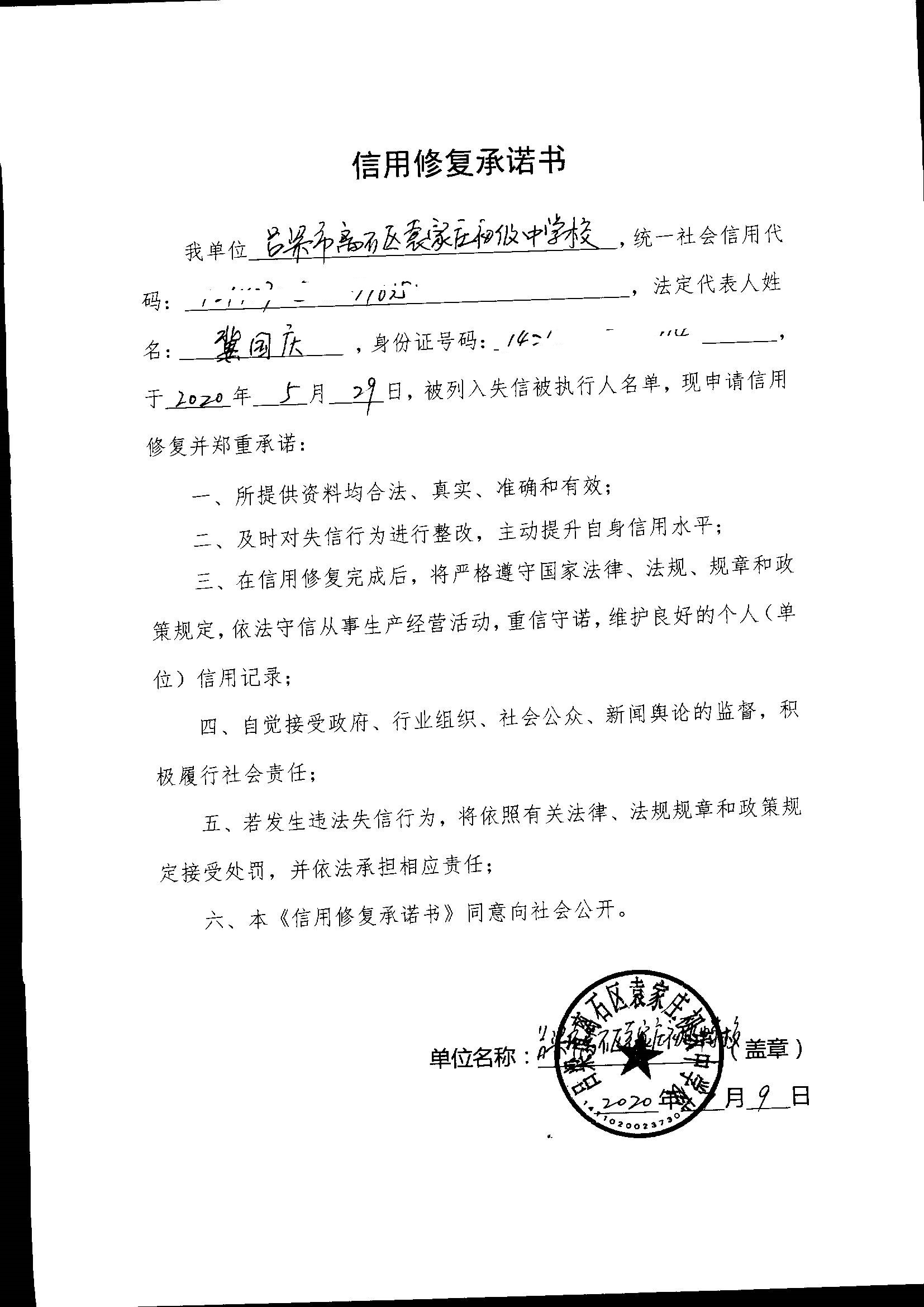 【信用修复承诺书】吕梁市离石区袁家庄初级中学学校