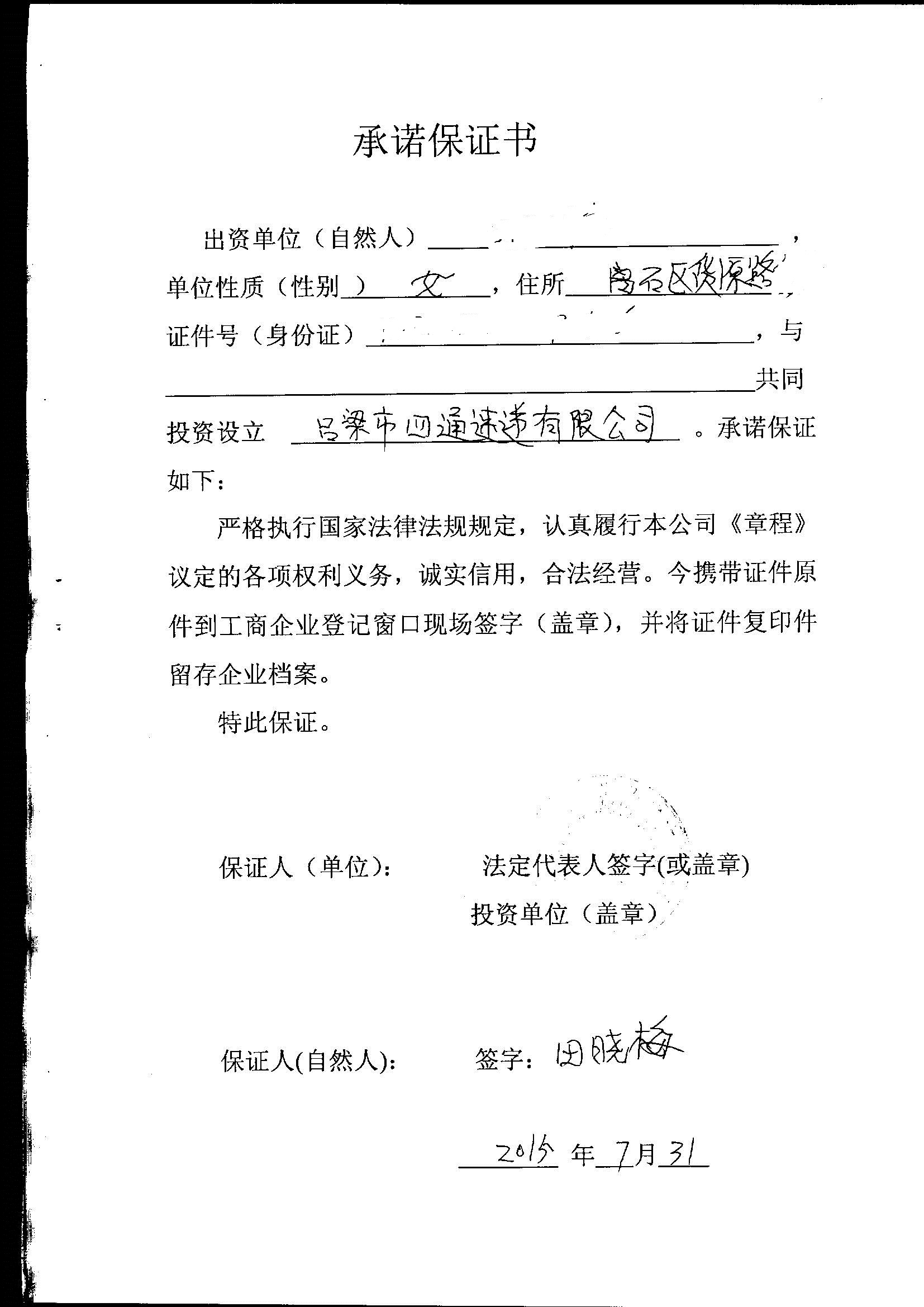 【主动公示型信用承诺书】吕梁市四通速递有限公司:2015版