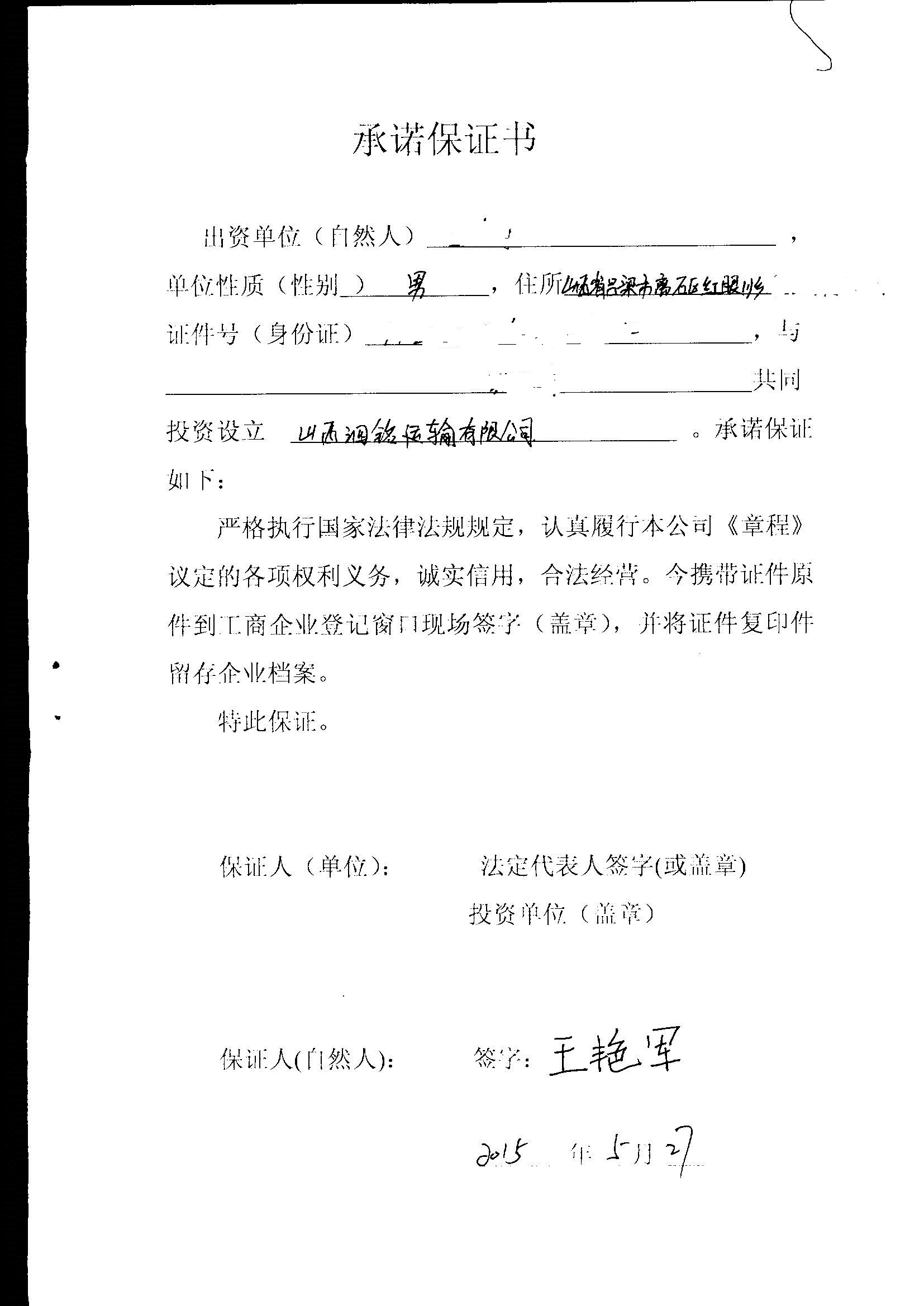 【主动公示型信用承诺书】山西泗铭运输有限公司