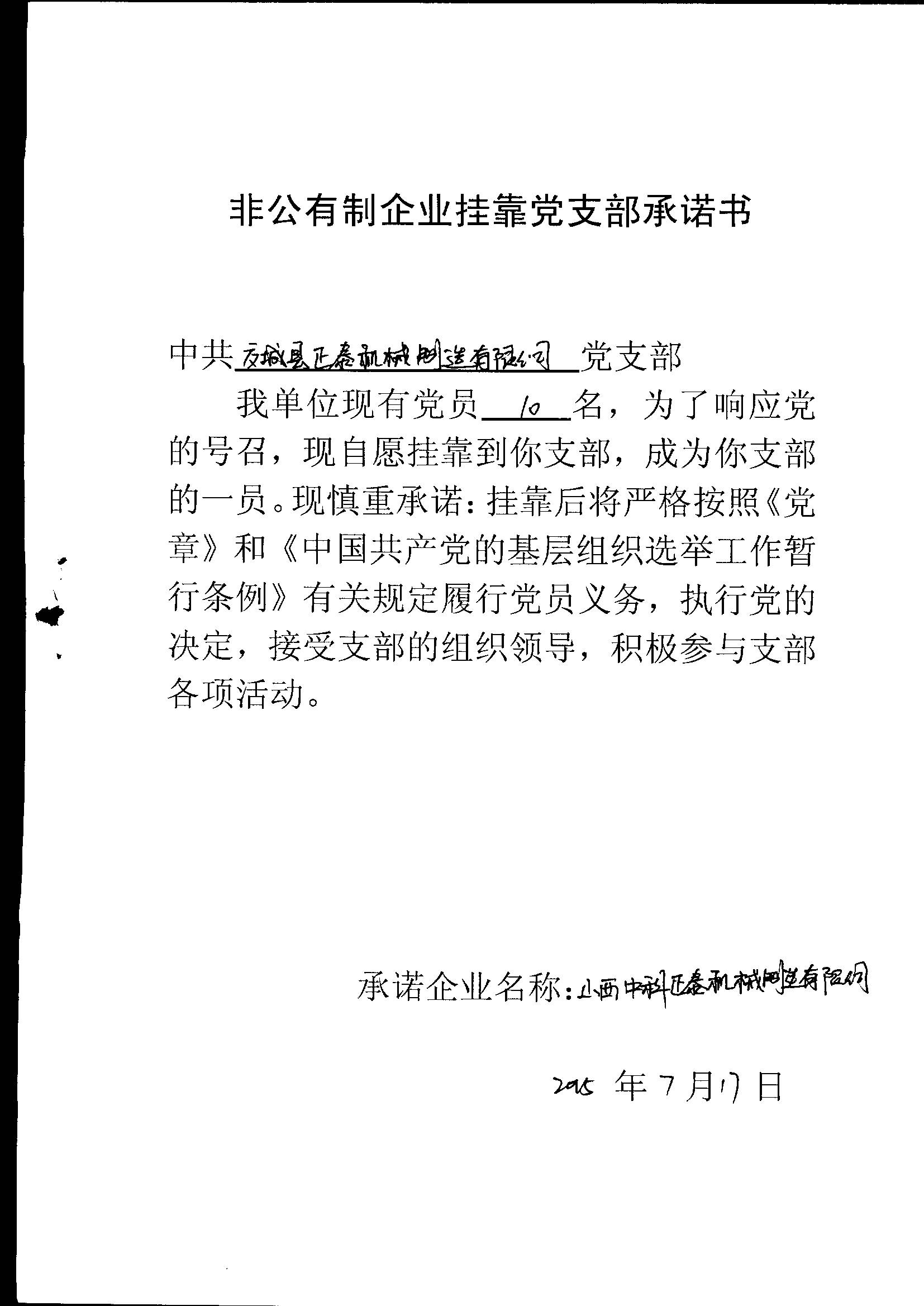 【主动公示型信用承诺书】山西中科正泰机械制造有限公司:企业挂靠党支部承诺书