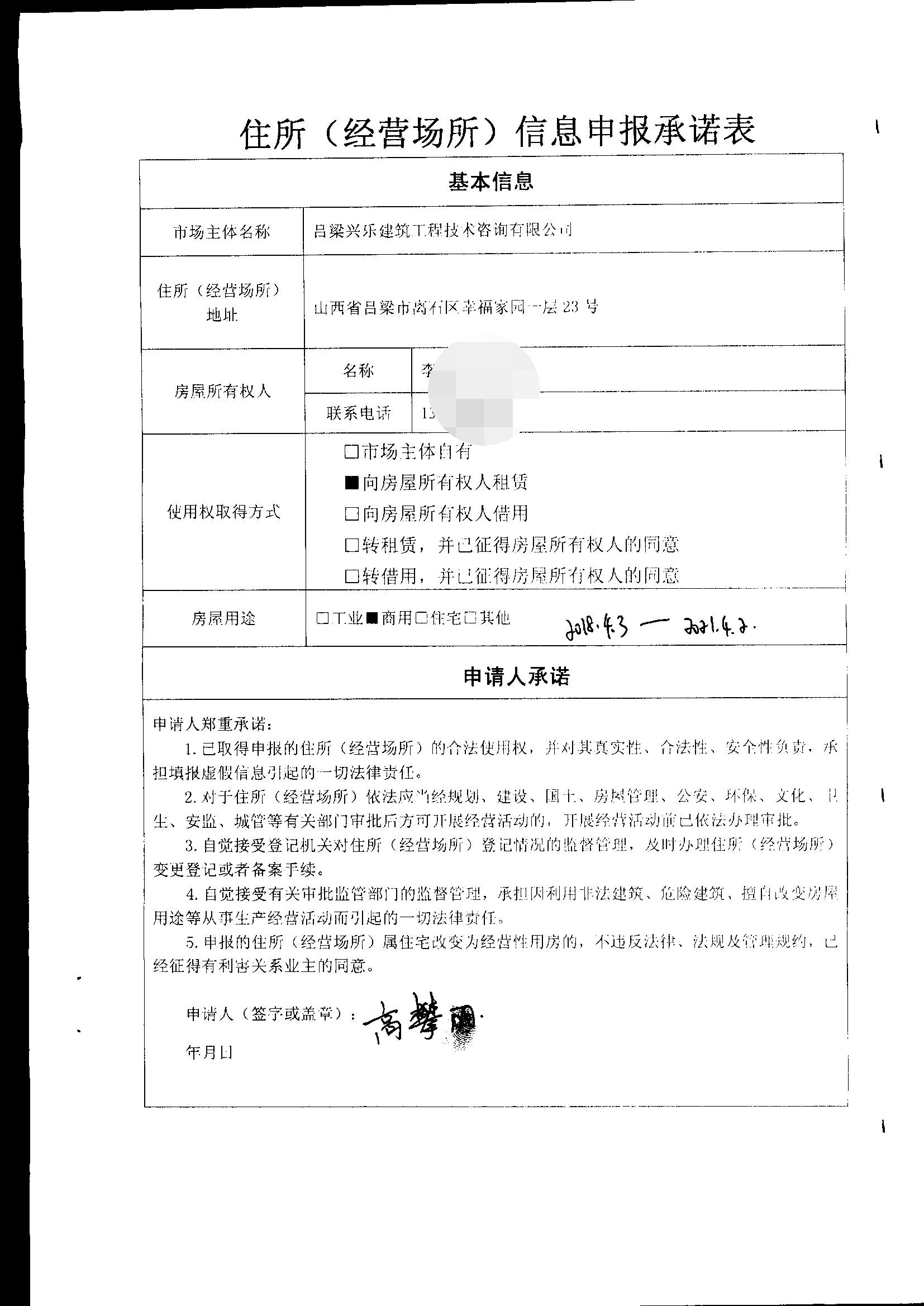1.主动公示型信用承诺:【主动公示型信用承诺书】吕梁兴乐建筑工程技术咨询有限公司:经营场所承诺书